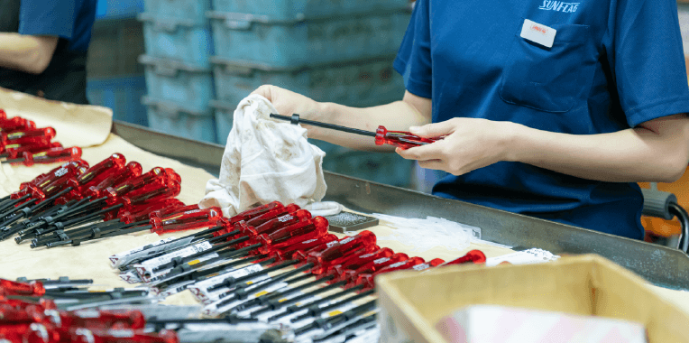 썬플래그는 원자재 조달부터 절삭, 열처리, 패키징, 상품화 등등 거의 모든 공정을 히가시 오사카의 자체 공장에서 처리하는 수직적 통합 시스템을 갖추고 있습니다.